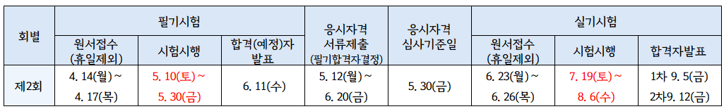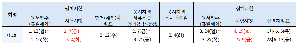 - 일요일: 기능장 제77회, 기사(산업기사·서비스) 제1회, 기능사 제1회·제4회